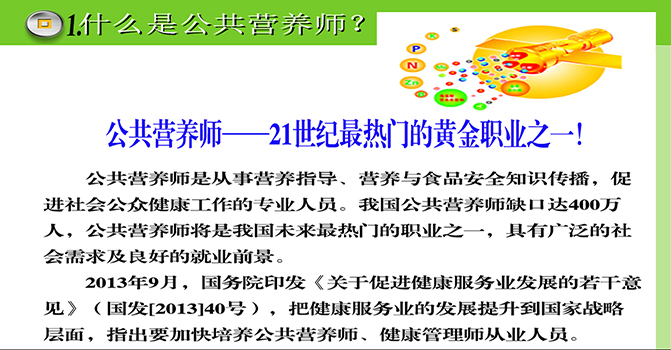 公共营养师作为一个新兴职业,其培训课程设置为:基础营养学、事务营养、社区营养、不同生理人群的营养、特殊环境营养、临床营养和营养流行病等主要课程。