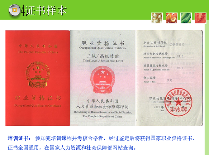 培训结束后,参加人力资源和社会保障部门统一组织的考试,合格者颁发相应等级《中华人民共和国职业资格证书》,此证书统一编号、全国通用、终身有效,是从业人员就业、求职、升职加薪的有效凭证。